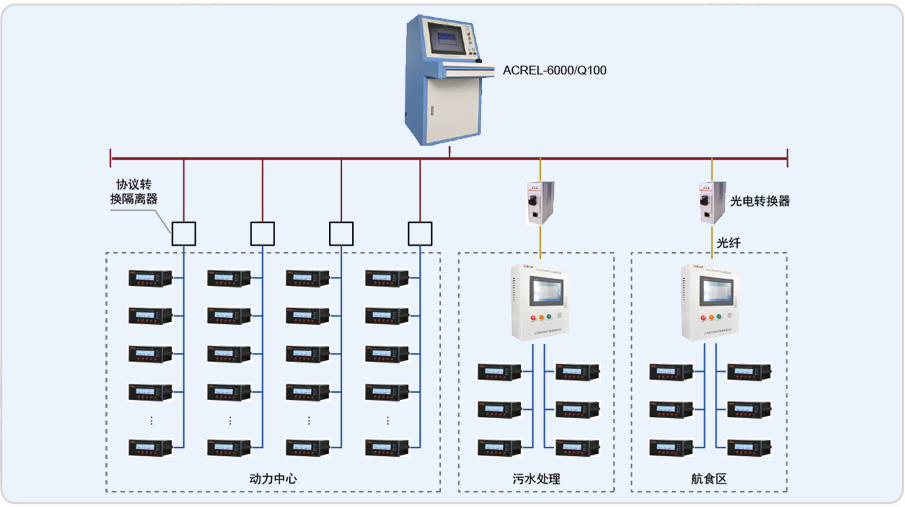 系統(tǒng)采用分層分布式結(jié)構(gòu),站控管理層及現(xiàn)場(chǎng)設(shè)備層,站控管理層設(shè)備為我公司一套琴臺(tái)式電氣火災(zāi)監(jiān)控設(shè)備及2套壁掛式電氣火災(zāi)監(jiān)控設(shè)備,對(duì)分散在各區(qū)域內(nèi)的ARCM剩余電流式電氣火災(zāi)監(jiān)控裝置進(jìn)行遙測(cè)、遙信,實(shí)現(xiàn)監(jiān)控與管理。各區(qū)域內(nèi)探測(cè)器采用RS485總線直接接入琴臺(tái)式電氣火災(zāi)監(jiān)控設(shè)備。系統(tǒng)采用Acrel-6000電氣火災(zāi)監(jiān)控系統(tǒng),實(shí)現(xiàn)對(duì)被保護(hù)電氣線路的實(shí)時(shí)監(jiān)測(cè)。