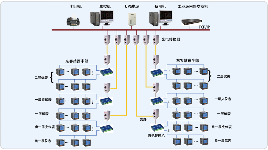 成都東客站電能管理系統(tǒng)采用雙機服務,位于東客站一層西南角值班中心,同時該系統(tǒng)配有6臺管理機,根據(jù)現(xiàn)場儀表的分布范圍,合理的分配6臺管理機的管理范圍;為保障數(shù)據(jù)傳輸?shù)膶崟r性和穩(wěn)定性,均采用光纖進行數(shù)據(jù)上傳。在值班室對管理機上傳的數(shù)據(jù)進行多樣式表現(xiàn)方式,畫面比較形象直觀;系統(tǒng)同時具備向BA系統(tǒng)轉發(fā)數(shù)據(jù)的功能。