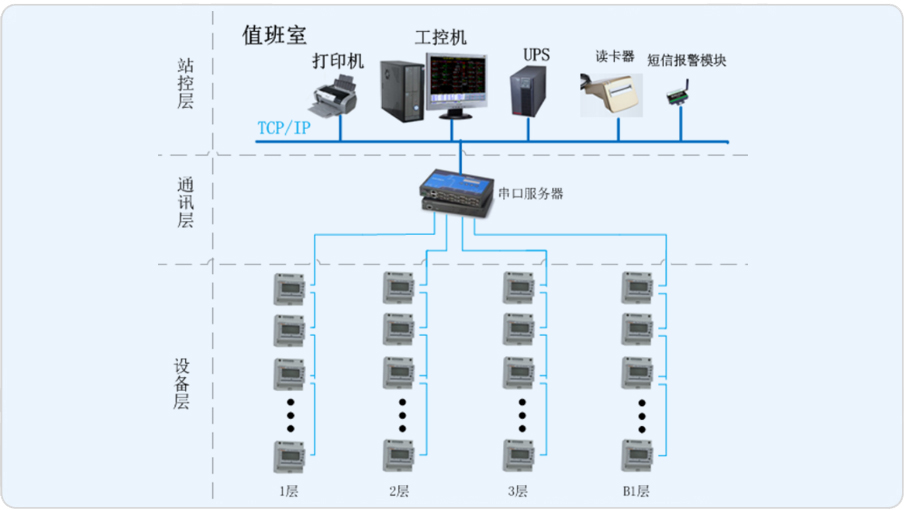 本系統(tǒng)主要實(shí)現(xiàn)對(duì)匯京國(guó)際廣場(chǎng)進(jìn)行用電監(jiān)控與電能管理。監(jiān)控范圍為樓層DTSY1352-C商戶預(yù)付費(fèi)儀表65塊,總線直接接入B1層值班室內(nèi)串口服務(wù)器,從而在監(jiān)控主機(jī)上實(shí)現(xiàn)總線上儀表與監(jiān)控主機(jī)的數(shù)據(jù)連通。通過(guò)使用Acrel-3000智能預(yù)付費(fèi)管理系統(tǒng)解決了由于商戶較多,管理不方便的問(wèn)題,這樣既管理方便、又節(jié)省人力,大大減少了物業(yè)的投入。