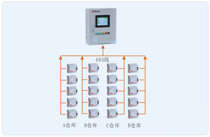 系統(tǒng)采用安科瑞消防電源監(jiān)控系統(tǒng),該系統(tǒng)主要采用分層分布式網(wǎng)絡(luò)結(jié)構(gòu),系統(tǒng)結(jié)構(gòu)為:站控管理層、網(wǎng)絡(luò)通訊層和現(xiàn)場設(shè)備層。其中廣陳第三方電子商務(wù)平臺托管產(chǎn)業(yè)基地現(xiàn)場設(shè)備分布為A、B、C、D倉庫以及綜合辦公用房消防配電回路。該系統(tǒng)監(jiān)控所有消防配電柜內(nèi)消防回路雙電源的實時運行狀態(tài),如有異常會后臺報警。所有監(jiān)測模塊通過485總線鋪設(shè)至消防控制室,消防電源監(jiān)控主機從而完成對監(jiān)測模塊的采集并監(jiān)控。