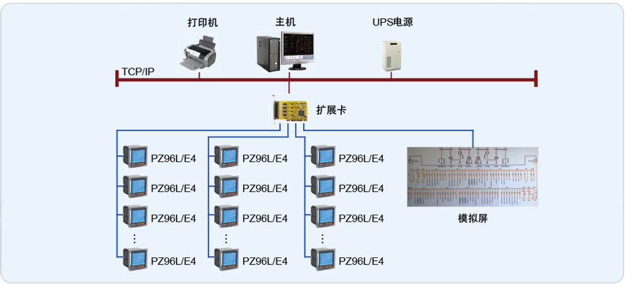 Acrel-2000電力監(jiān)控主要實(shí)現(xiàn)北京電氣工程學(xué)校變電所的0.4kV配電系統(tǒng)的用電監(jiān)測(cè)與模擬屏的實(shí)時(shí)監(jiān)控;監(jiān)測(cè)范圍為變電所的T1、T2變壓器的低壓進(jìn)線(xiàn)柜、聯(lián)絡(luò)柜、饋線(xiàn)柜中的智能電力儀表和模擬屏,從而實(shí)現(xiàn)遠(yuǎn)程實(shí)時(shí)監(jiān)測(cè)和模擬屏的實(shí)時(shí)監(jiān)控。該系統(tǒng)總計(jì)有61只儀表(其中全部為PZ系列智能儀表)和一個(gè)模擬屏,分4條總線(xiàn),由于變電所與值班室距離較近,采用變電所內(nèi)自行組網(wǎng),然后通過(guò)擴(kuò)展卡直接接至電腦,實(shí)現(xiàn)該現(xiàn)場(chǎng)總線(xiàn)上儀表、模擬屏與監(jiān)控主機(jī)的數(shù)據(jù)連通。
