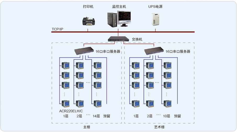 現場設備層設備為600臺電力儀表。這些設備分別根據設計要求安裝在相應的配電回路上。通過RS-485接口實現與上位機系統的數據交互。多功能表的通訊規約為Modbus-RTU;通訊管理層由2臺Nport-5630串口服務器構成。串口服務器將RS-485總線協議轉換為工業以太網協議,通過TCP/IP與站控管理層主機相連,構建數據鏈路。通訊管理層設備均安裝在電氣值班室的值班人員操作臺中,與站控管理層設備安裝在一起;站控管理層設備為華北工控主機、顯示器、HP打印機以及山特UPS電源,均安裝在電氣值班室的操作臺中。通過安裝在主機上的Acrel-2000電力監控系統軟件實現對現場儀表數據的采集、處理以及各種人機交互功能。