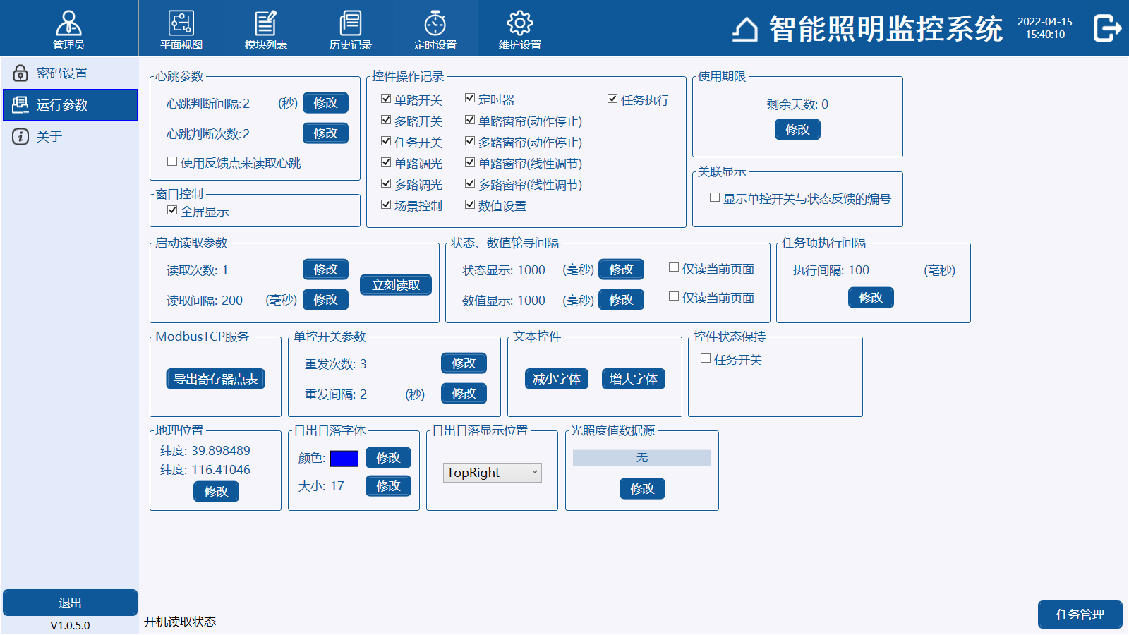 9)系統可以通過預設的當地經緯度信息,自動計算每天的日升日落時間;根據天文時鐘控制照明開關,實現日落開燈、日出關燈的功能。