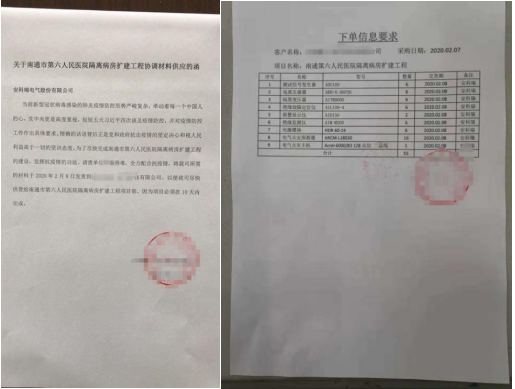 2月7日,安科瑞接到南通市第六人民醫(yī)院隔離病房擴建工程協(xié)調材料供應函,要求在2月8日下午貨到南通。