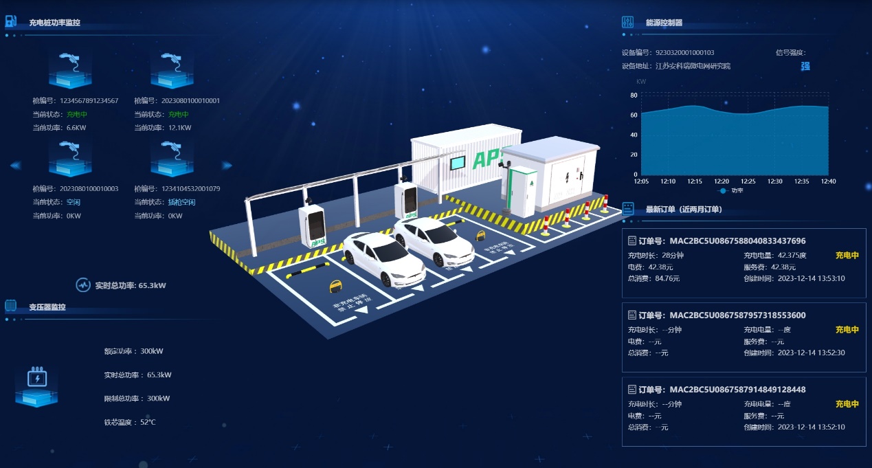 該充電站利用有序充電運營平臺進行充電樁管理,通過智能調度系統根據監測設備實時功率上報,對充電站的總功率進行超限檢測。一旦超過設定限制,系統會按照時間、電量或均衡的方式對充電樁進行降檔調度,以有效控制功率。當總功率恢復正常時,系統會根據智能算法對降檔設備進行有序調節升檔,合理分配充電資源。
