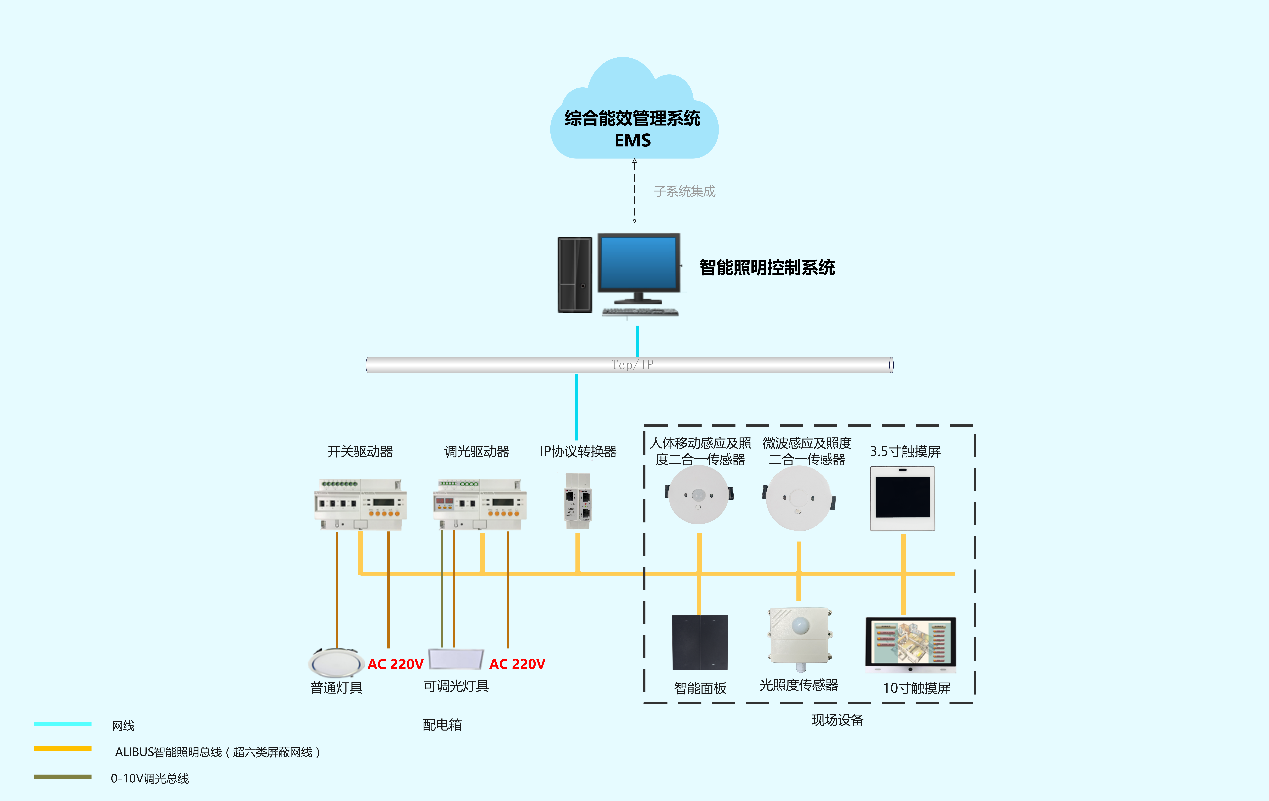 系統(tǒng)在照明配電箱內(nèi)的模塊主要有開(kāi)關(guān)驅(qū)動(dòng)器、IP網(wǎng)關(guān)、路燈控制器、時(shí)間控制器、干接點(diǎn)輸入模塊等。這些模塊使用35mm標(biāo)準(zhǔn)導(dǎo)軌安裝。另外安裝在控制現(xiàn)場(chǎng)的模塊主要有光照度傳感器、紅外傳感器和智能面板。有人經(jīng)過(guò)可以設(shè)定紅外感應(yīng)控制亮燈,人離開(kāi)后在設(shè)定的時(shí)間內(nèi)熄燈,智能面板等手動(dòng)控制設(shè)備,可實(shí)現(xiàn)自動(dòng)控制、現(xiàn)場(chǎng)控制和值班室遠(yuǎn)程控制相結(jié)合。