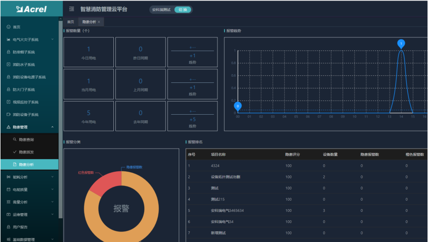 用戶登錄成功之后進入首頁,如圖所示。主要展示的內容有:項目概況、設備狀態(tài)、探測器分類、設備報警信息、報警分類、報警統(tǒng)計、設備臺賬信息等。其中百度地圖可以選配成3D建筑模型。