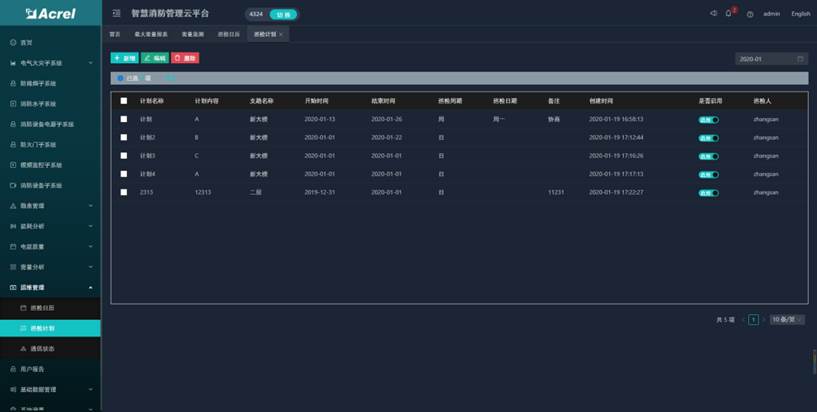 點擊菜單中的巡檢計劃,進入對應的頁面,對相關的巡檢計劃進行查看工單,切換日期來查詢所要預覽的數據,支持對巡檢計劃的新增,修改和刪除。